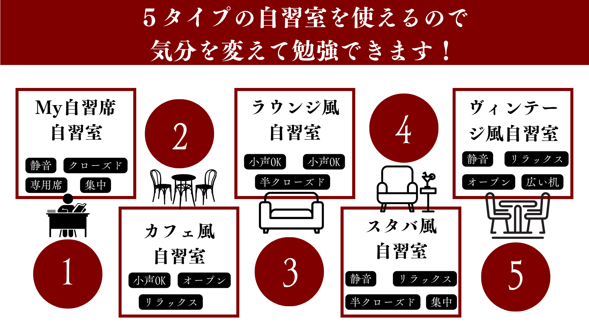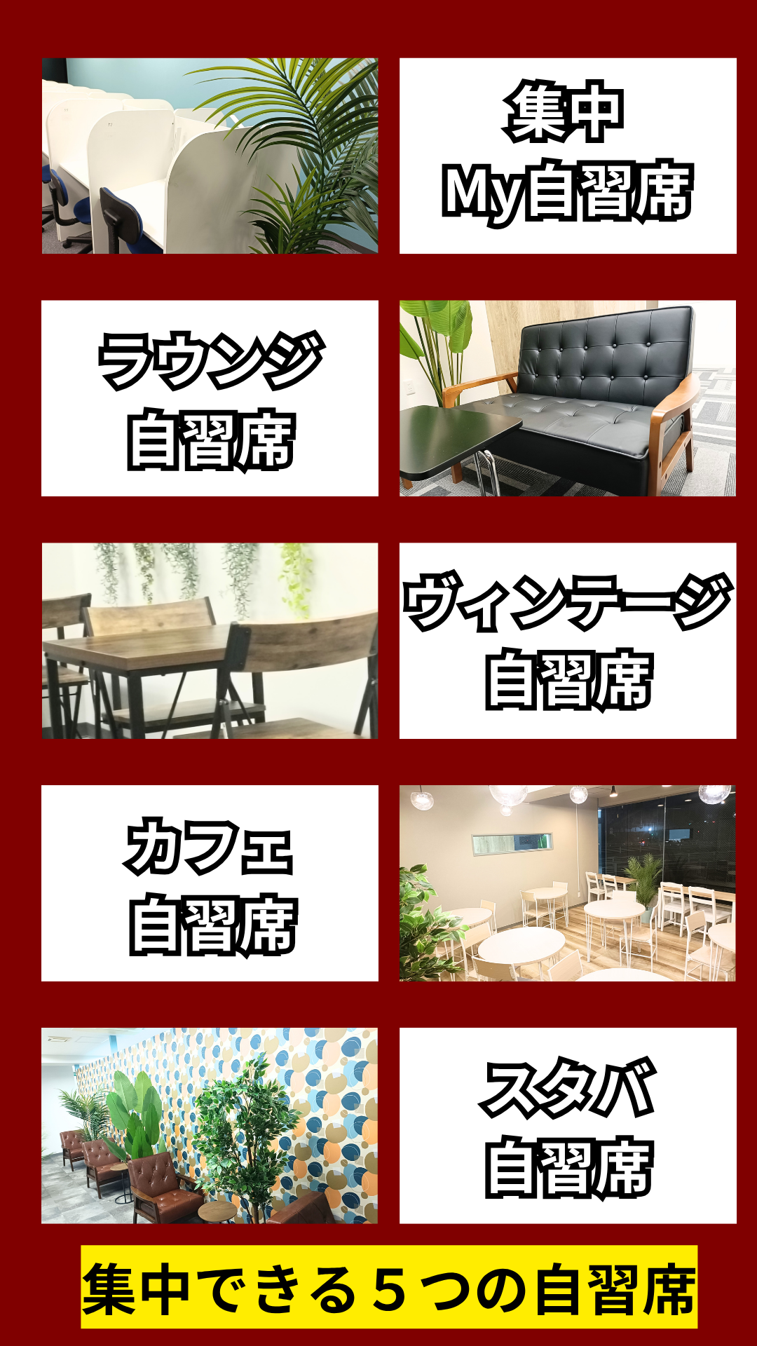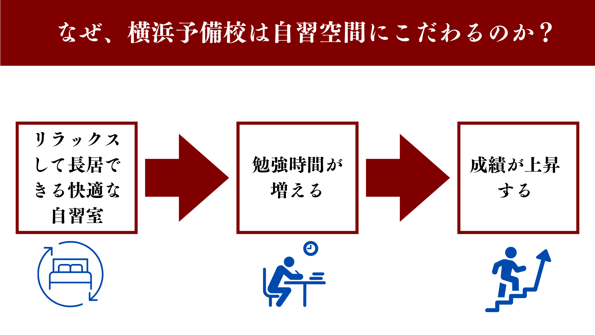 自習室に長時間居たくなる⇒学習時間が増える⇒成績が上がる。