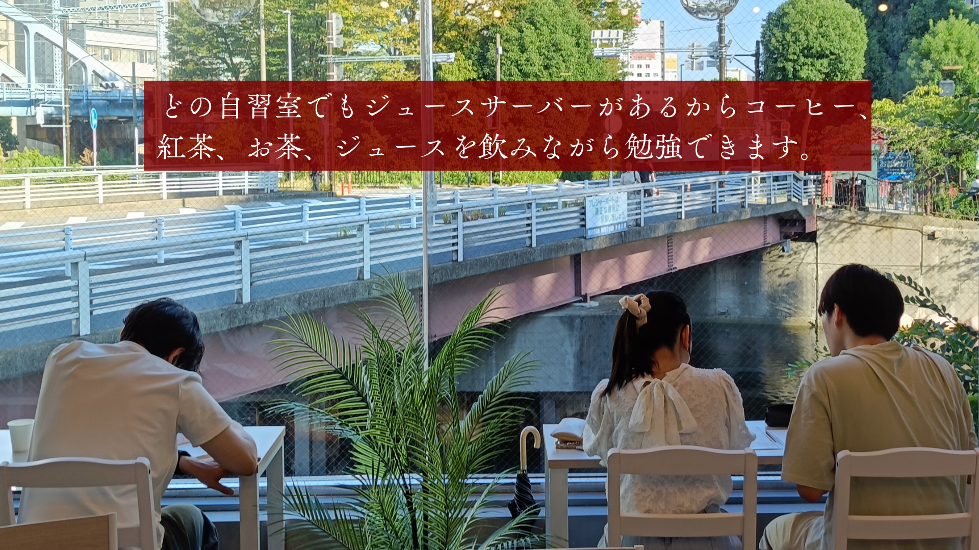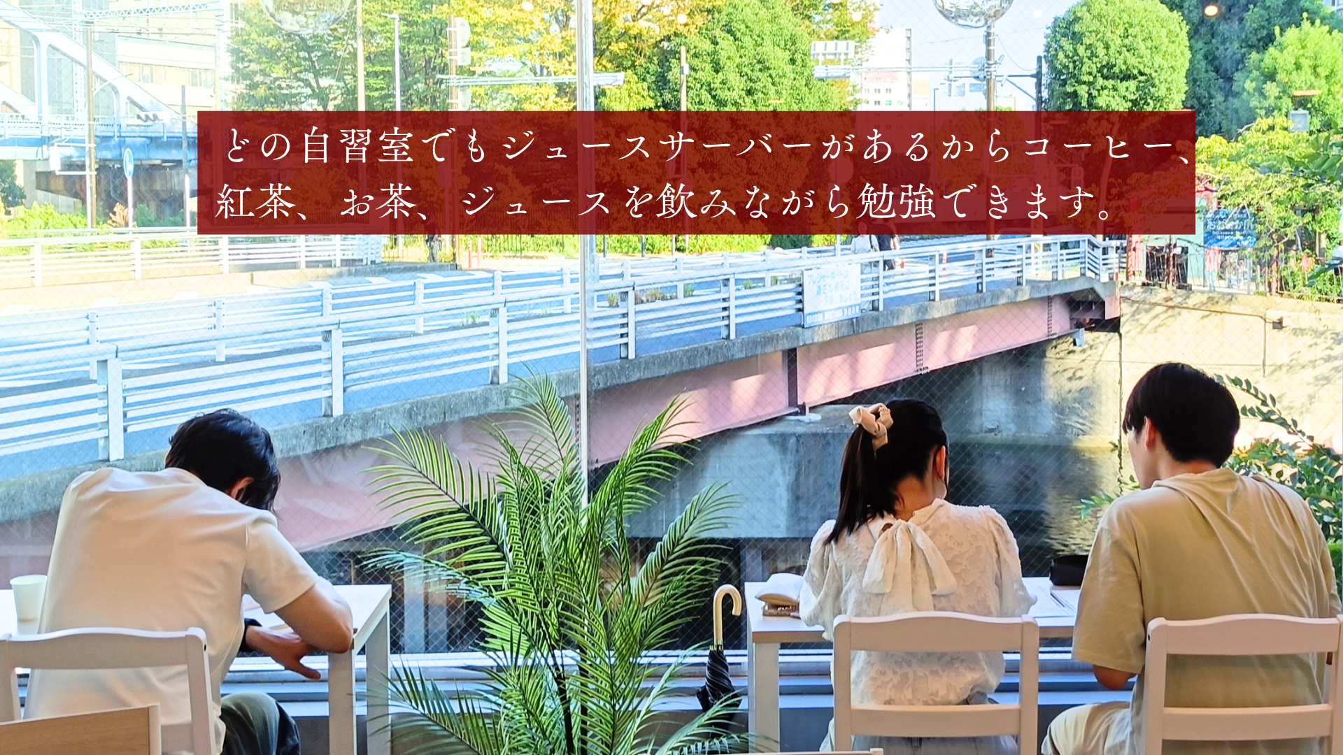 どの自習室でも無料のドリンクサーバーでコーヒーや紅茶、お茶、ジュースを飲みながら勉強できます。