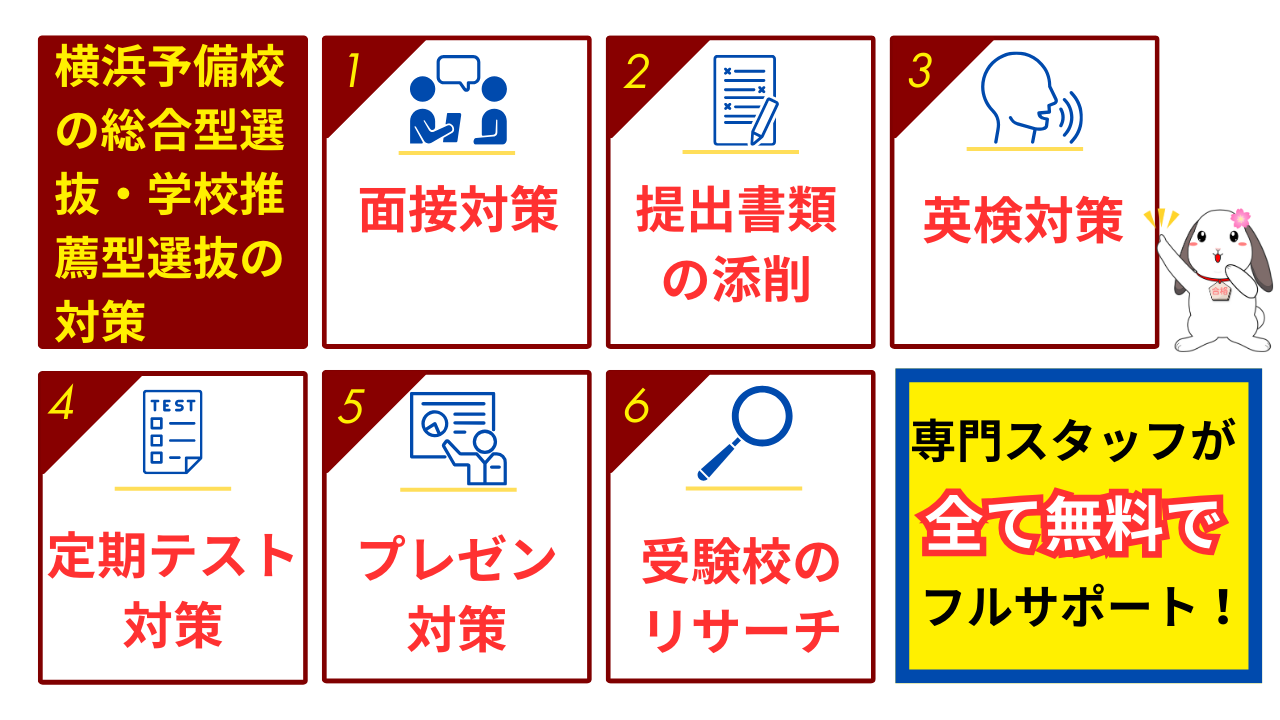 横浜予備校では、教室・自習室・図書館・設備などの利用料、入会金や教材費、夏期講習などの費用はかかりません。また、推薦対策などもすべて無料でフルサポートします。