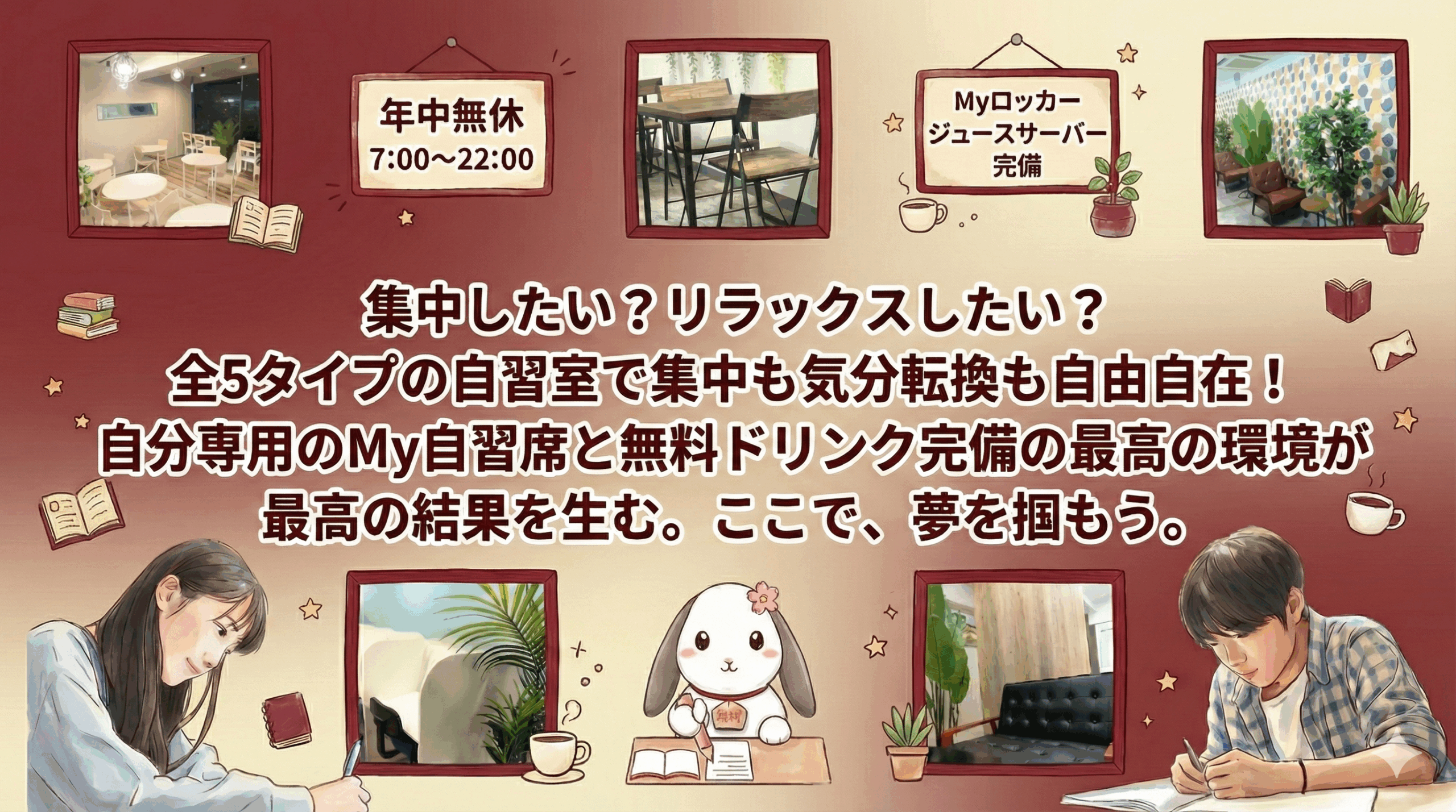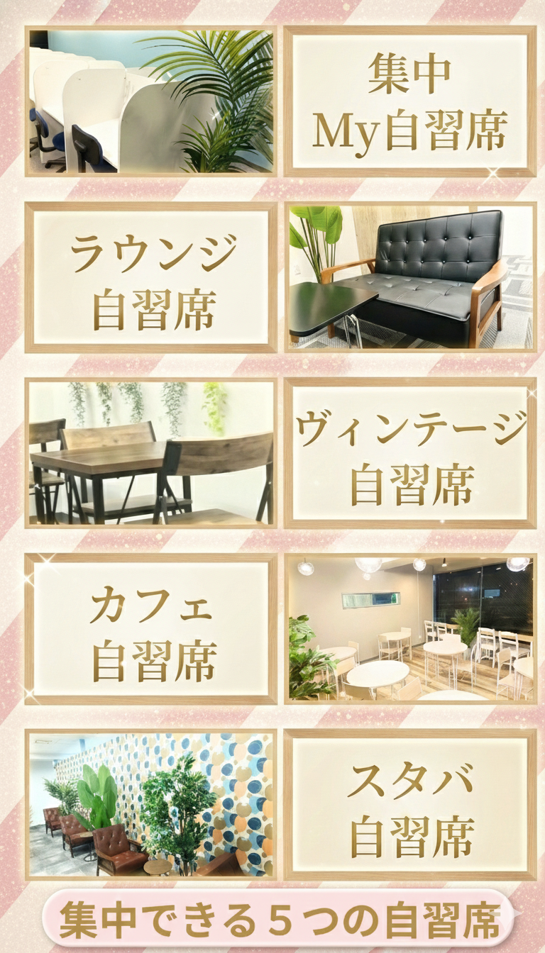 カフェ風、スタバ風、ヴィンテージ風…その日の気分で選べる5つの自習室 。