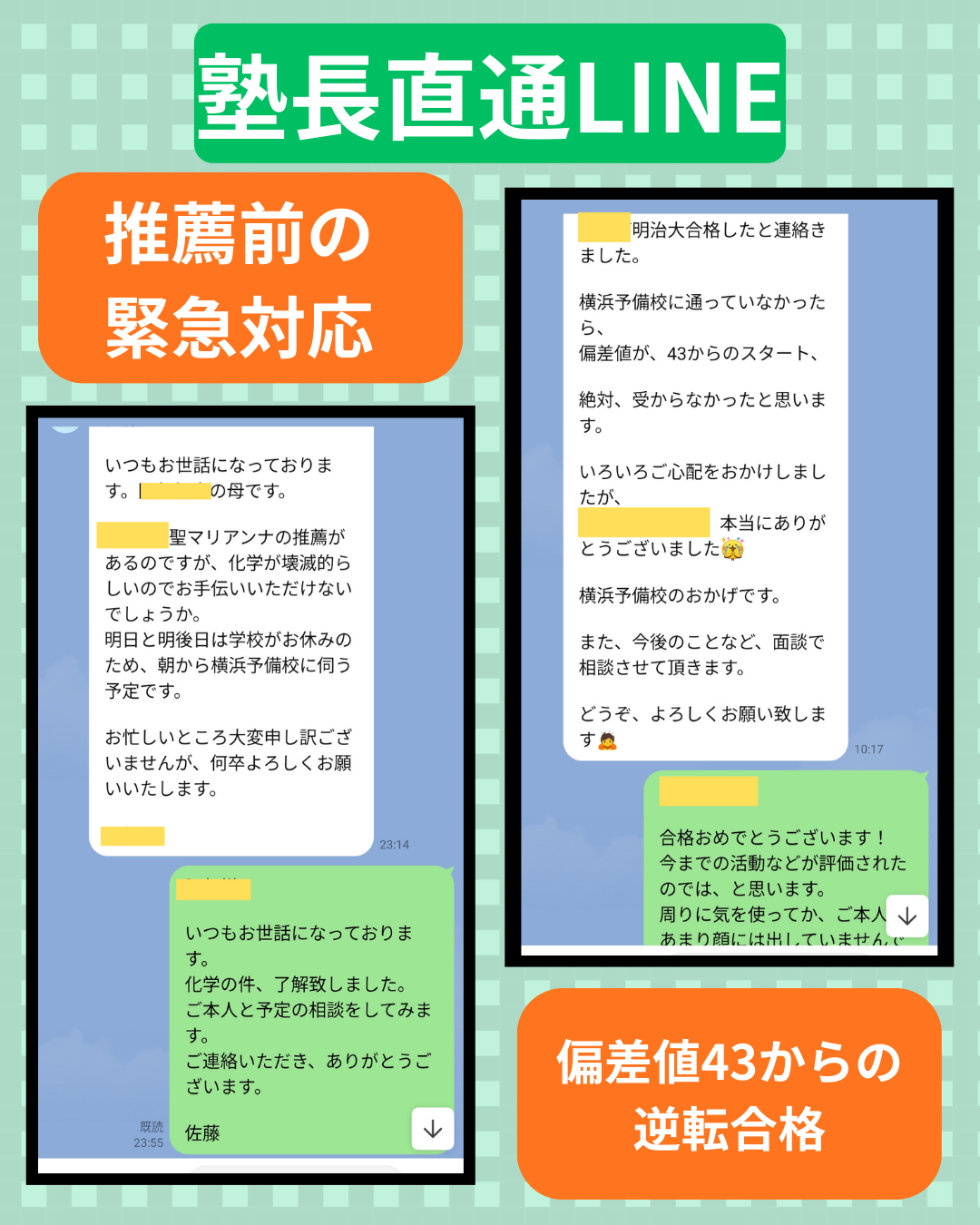 また、生徒・保護者様は塾長の佐藤とLINEで24時間いつでもつながれます。