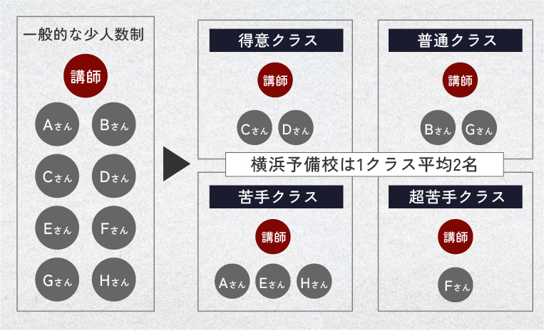 横浜予備校は、科目別・レベル別に徹底的に細分化してクラス編成します。