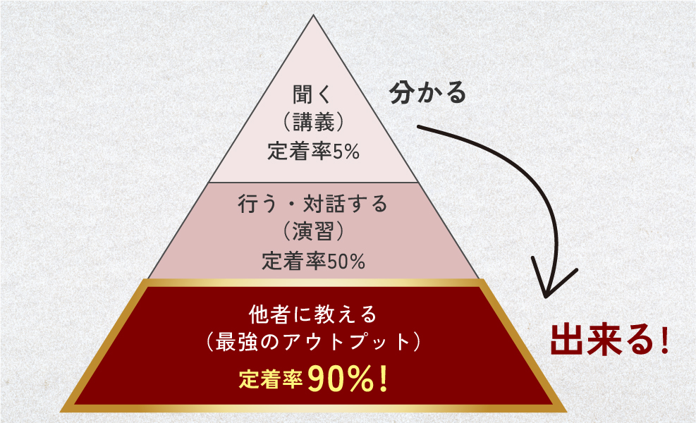 『講義』だけでは定着率5%、『人に教える』までを実践できれば、定着率は90%と言われています。